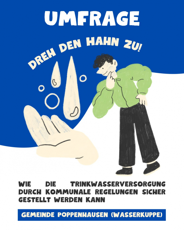 Die Gemeinde Poppenhausen (Wasserkuppe) führt im Rahmen einer Projektarbeit eine kurze Umfrage zur aktuellen Situation der Trinkwasserversorgung durch. Im Fokus stehen dabei insbesondere die Nutzung von Zisternen sowie mögliche Maßnahmen im Rahmen einer Gefahrenabwehrverordnung.